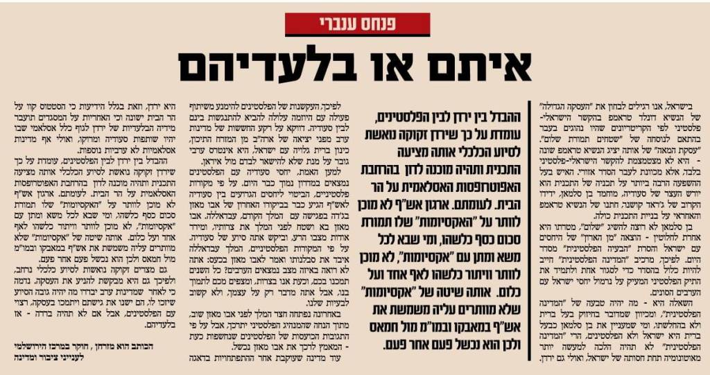 מדינות ערב ממתינות כעת לפלסטינים, אבל אם לא יבואו — יילכו לנורמליזציה עם ישראל בלעדיהם. ירדן כעת מתנגדת, אבל יש הבדל בינה לבין הפלסטינים: היא בסופו של דבר תתפשר בשביל סיוע כלכלי, שהיא זקוקה לו מאוד. הפלסטינים לא יסכימו לקבל סיוע כלכלי, וישארו בסרבנותם.